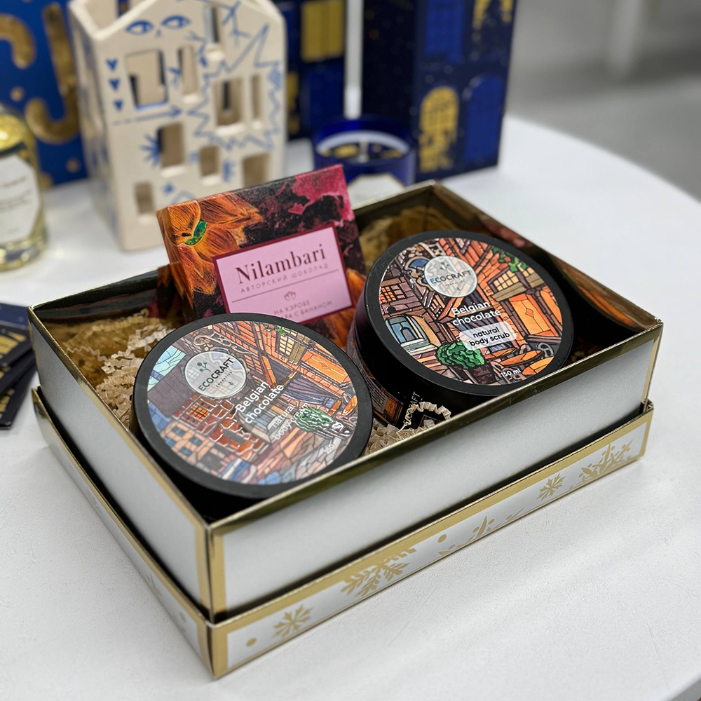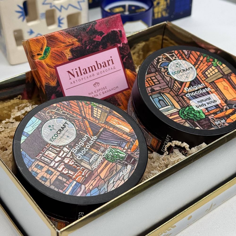 Для тех, кто любит шоколад - во всех его проявлениях! В набор входит: Скраб для тела "Бельгийский шоколад" Ecocraft; Крем для тела "Бельгийский шоколад" Ecocraft; Шоколад на кэробе без сахара с бананом Nilambari; Подарочная упаковка и фирменная открытка!